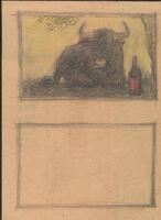 Toro descansando Un Boceto con la imagen de un toro con un fondo a color, descansando en el campo bajo un árbol y a su lado una botella. Debido a que podemos reconocer la botella (Fino Quinta) podemos deducir que este pequeño boceto podría ser uno de los primeros proyectos para un anuncio de las Bodegas Osborne.