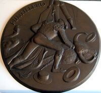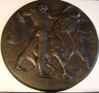 Puntillero Fotografía de la cara de una medalla donde se aprecia el bajorrelieve que representa la escena de un puntillero dando la puntilla al toro que lo remata definitivamente evitando así la angustiosa agonía del toro.2ª Tauromaquia OTROS ARCHIVOS: MBO/282.3 MEN/1592