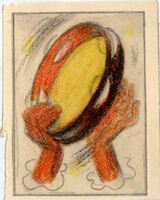 Pandereta Un instrumento musical, en este caso una pandereta amarilla es cogida por dos manos, de piel oscura, que la agita en el aire para hacerla sonar. Una escena musical en un dibujo enmarcado.Boceto realizado para la ilustración de la revista semanal Novelas y Cuentos. Titulo: Autor: Nº public. Fecha: Tomo Nc. PI/. No