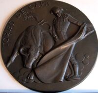 Toreo de capa Fotografía de la cara de una medalla donde se aprecia el bajorrelieve que representa la escena de un torero haciendo un pase con el capote al toro que le embiste, con el polvo que levantan sus patas.2ª Tauromaquia. OTROS ARCHIVOS: MBO/290.8 MEN/1600