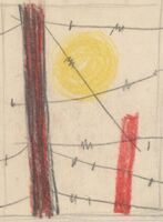 PRISIONERO DE GUERRA Imagen de una alambrada de pinchos, a través de ella se observa un sol representado por una esfera amarillo, y palo o algo similar en rojo. La alegría del sol se ve contrarestada, rota, rallada, por la tristeza de la alambradas.Boceto realizado para la ilustración de la revista semanal Novelas y Cuentos. Titulo:PRISIONERO DE gUERRA Autor: S.M.STEEMAN Nº publicado:1210 Fecha18-07-1954: Tomo NC.:54