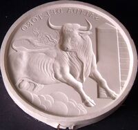 Salida del toro Molde de escayola del negativo de una medalla que representa a un toro que sale de los toriles con fuerza a la arena del ruedo. La imagen del animal tiene la fuerza icónica de un tótem.Otros archivos: MBO/290.Img.3 MG/1405