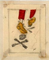Pasos de la muerte Dos piernas de las que sólo se vislumbran unas botas amarillas y un trozo de pantalón rojo caminan dejando como huellas el símbolo de la muerte: representado por una calavera y dos huesos entrelazados en color negro. Toda la escena enmarcada parece acompañada por el boceto de la posible firma del artista.Boceto realizado para la ilustración de revista Novelas y Cuentos: Titulo: Autor: Nº public.: Fecha. Tomo NC. Prueba Imprenta: 103