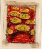 Sombreros mejicanos de color amarillo Encima de formas piramidales rojas que forma las típicas capas mejicanas, que apenas han sido definidas por el artista, se hallan una multitud de sombreros mejicanos de color amarillo. El dibujo está enmarado.Boceto realizado parala ilustración semanal de la revista Novelas y Cuentos.