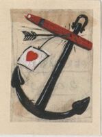 PERSUASION. Imagen central de un ancla en negro, atravesada por una flecha de donde cuelga la etiqueta en blanco de un corazón en rojo.Boceto realizado para la ilustración de la revista semanal Novelas y cuentos. Titulo: Persuasión. Autor: Jane Austen. Nº publi8cado: 874. Fecha: 08-02-1948. Tomo NC.: 5