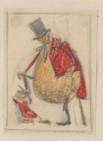 SACO REPRESENTADO A UN HOMBRE La figura central, es un personaje rico con una gran panza amarilla, con una levita en rojo, chistera y bastón, y en la parte inferior izquierda, la silueta en rojo de un pobre niñoBoceto realizado para la ilustración de la revista semanal Novelas y Cuentos. Titulo: Autor: Nº publicado: Fecha: Tomo NC.: