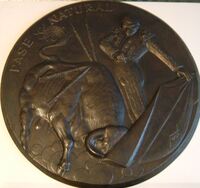 Pase natural Fotografía de la cara de una medalla titulada pase natural donde se aprecia el bajorrelieve que representa la escena del pase de un torero al toro. El toro parece que se sale de la medalla.2ª Tauromaquia. OTROS ARCHIVOS: MBO/282.8 MEN/1587