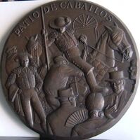 Patio de Caballos Fotografía del bajorrelieve de la ara de una medalla, con la escena de un picador sobre su caballo rodeado por una multitud de gente en primer término una pareja hablando con un hombre.2ª Tauromaquia. OTROS ARCHIVOS:MBO/290.6 MEN/1596