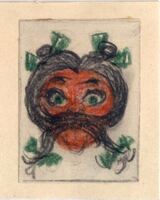 Todo queda en casa En el dibujo enmarcado se visualiza una gran cara en tonos anaranjados fuertes, de grandes ojos verdes y de abundante cabellera en tonos negros desplegada alrededor de toda la figura facial. Unos lazos de color verde adornan dicha cabellera en su parte superior y en sus puntas.Bocetos realizados para la ilustración de la revista Novelas y Cuentos: Titulo: Todo queda en casa Autor: Margaret Millar Nº publicación: 1002 fecha: 23-07-1950 Tomo NC 35 Prueba de Imprenta: 105