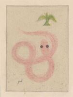 Serpiente y paloma Dibujo de una serpiente rosa enroscada ocupando toda la escena y sobre ella una paloma con las alas abiertas en tonos verdes.Boceto realizado para la ilustración de la revista semanal Novelas y Cuentos. Titulo: Autor: Nº publicado: Fecha: Tomo NC.: