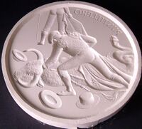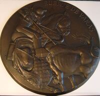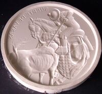 Suerte de Varas Fotografía de la cara de una medalla donde se aprecia el bajorrelieve que representa la escena de un picador a caballo insertando su pica al toro que le embiste. Ni siquiera se aprecia la cabeza del toro.2ª Tauromaquia. OTROS ARCHIVOS: MBO/290.1 MEN/1598