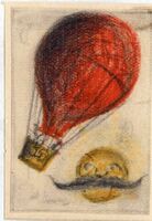 TON SAWYER A TRAVES DEL MUNDO Representado en el cielo un globo, ligeramente inclinado y de color rojo realiza su vuelo mientras lo observa un sol de grandes ojos y bigote espeso y oscuro, quizá como representando algún cuento de viajes.Boceto realizado para la ilustración de la revista semanal Novelas y Cuentos. Titulo: Ton Sawyer a través del Mundo. Autor: Mark Twain. Nºpublic.: 1073. Fecha: 02-12-1951. Tomo NC.: 47. PI/. 149.