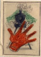UN VIAJE TRAGICO En este dibujo se representa una gran mano abierta y de color rojo que intenta detener un tren. El emblemático dibujo se explicaría con la lectura del cuento. A lo lejos se aprecia un paisaje de montes.Boceto realizado para la ilustración de la revista semanal Novelas y Cuentos. Titulo: Un viaje trágico. Autor: Fred M. White. Nº public.: 902. Fecha: 22-08-1948. Tomo NC.: 2. PI/. 406.