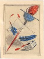 VIDA POR HONRA Una hoja blanca de papel, al igual que la pluma azul, es atravesada por una espada con ligeros tintes rojizos queriendo parecer sangre. La pluma se rompe en dos partes. El tintero es movido bruscamente vertiendo tinta roja. Otra vez, el dibujo se halla enmarcado.Boceto realizado para la ilustración de la revista semanal Novelas y Cuentos. Titulo: Vida por honra. Autor: J. E. Hartzenbusch. Nº public.: 1102. Fecha: 22-06-1952. Tomo NC. 42. PI/. 198