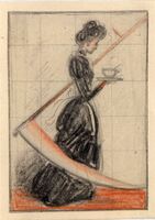 UNA CRISTIANA. La muerte está representada por una esbelta figura femenina con un traje negro y portando en su mano una taza de té; su figura se encuentra de perfil y en actitud caminante. Una guadaña enorme envuelve a la mujer en la que se aprecia una enorme calma y silencio.Boceto realizado para la ilustración de la revista semanal Novelas y Cuentos. Titulo: Una Cristiana. Autor: Emilia Pardo Bazán. Nº public.: 1697. Fecha: 17-11-1963. Tomo NC.: 25. PI/. No