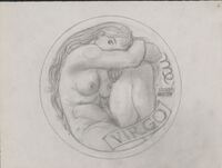 Anverso de la medalla Virgo, dibujo serie signos del zodiaco Boceto a lápiz del anverso de la medalla que representa el signo del zodiaco Virgo, con la imagen de una mujer desnuda de gran melena larga que cae sobre su espalda que se apoya sobre sus brazos cruzados sobre una de sus rodillas.Dibujo realizado para la medalla titulo VIRGO (anverso) encargo de INSTITUTO NUMISMATICO. ME/Galb/1412 ME/Esc. NO