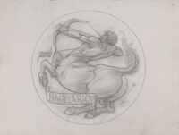 Anverso Sagitario Boceto a lápiz del anverso de la medalla correspondiente al signo sagitario, representado por un centauro mitad hombre mitad caballo practicando el tiro al arco, junto a la medalla anotaciones a lápiz del autor.