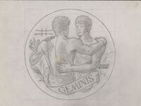 Anverso de la medalla Géminis/ serie SIGNOS DEL ZODIACO Boceto a lápiz del anverso de la medalla que representa el signo del zodiaco Géminis, con la imagen de un hombre de espaldas saludando a otro, muy parecida a él mismo, de frente con un abrazo.Dibujo realizado para la serie signos del zodiaco. Titulo Gemenis (anverso) . Trabajo realizado para INSTITUTO NUMISMATICO. ME/Galb1416