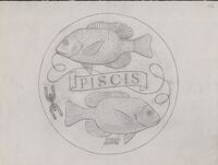 Anverso de la medalla Piscis dibujo para su realización Boceto a lápiz del anverso de la medalla que representa el signo del zodiaco Piscis, con la imagen de dos peces en posiciones opuestas y entre los dos el cartel con las letras piscis.Dibujo realizado para la formalización de la medalla titulada PISCIS (anverso) por encargo de INSTITUTO NUMISMÁTICO. ME/Galb/1419 MEN/1839