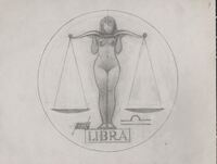 Anverso de la medalla Libra dibujo para su realizacion Boceto a lápiz del anverso de la medalla que representa el signo del zodiaco Libra, con la imagen central de una balanza caracterizada con el cuerpo desnudo de una mujer que sujeta con sus manos dicha balanza.Dibujo para realizar la medalla de signos del zodiaco titulo LIBRA encargado por INSTITUTO NUMISMATICOME/Galb/.1414 ME/ otros archivos NO