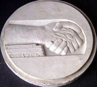 Apretón de manos Molde de escayola de la cara de una medalla donde se representa con enorme realismo el apretón de manos de dos brazos junto a la silueta de un vagón de tren, como simbolizando regiones que a través de este medio se acercan.