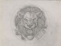 Anverso Leo Boceto a lápiz del anverso de la medalla correspondiente al signo leo representado por la cabeza de un león, que abre su gran boca con un rugido junto a la medalla anotaciones a lápiz del autor.