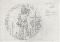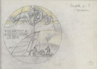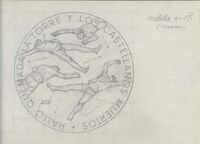 Boceto del reverso de la medalla número dieciocho serie del V centenario del descubrimieto de América. Boceto a lápiz del reverso de la medalla número dieciocho, donde se representa la tragedia final de un ataque indígena al fuerte, con la imagen de un grupo de hombres tendidos en el suelo en diferentes posturas junto a flechas que indican la causa de su muerte, junto a las letras que ocupan el perfil de la medalla donde leemos “halló quemada la torre y los castellanos muertos”.para Numismática Iberica serie V Centenario … Otros Archivos: MBR/1357(anverso y reverso)