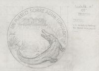 Boceto del reverso de la medalla nº 25 serie V centenario del descubrimiento de América. Boceto a lápiz del reverso de la medalla número veinticinco, donde en primer término aparece un cocodrilo que mira la silueta de un poblado sobre unas estructuras de madera que le aíslan y separan del agua, junto a la leyenda inscrita en el perfil de la medalla que dice “un pueblo fundado sobre el agua”.Para Numismática Iberica. OTROS ARCHIVOS: MBR/ 1339 MBO/390+424+482
