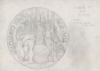 Boceto del reverso de la medalla nº 24 V centenario del descubrimiento de América. Boceto a lápiz del reverso de la medalla número veinticuatro, que representa una escena completamente contraria a la descrita en su anverso y es el ataque por parte de los indígenas a soldados y expedicionarios españoles, junto a la leyenda inscrita en la medalla que dice “De la oscuridad del océano el mundo se abría”.para Numismática Íberica. OTROS ARCHIVOS: MBR/1363 MBO/418+479