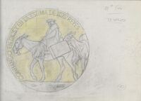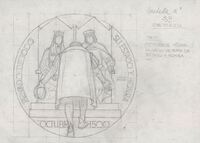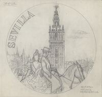 Boceto del anverso de una medalla de Sevilla. Boceto a lápiz del anverso de una medalla representativa de la ciudad de Sevilla, donde en primer término se aprecia a una pareja a caballo, la mujer vestida contraje andaluz junto a un hombre vestido de corto y de fondo se observa la Giralda.Realizada para Acuñaciones Españolas. Otros Archivos: MBR/1492