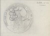 Boceto del reverso de la medalla nº 16 serie V centenario del descubrimiento de américa. Boceto a lápiz del reverso de la medalla número dieciséis donde se aprecia una mano de la que cae un gran montón de semillas rodeado por las letras en las que se lee “esto fue la simiente de donde todo ha salido.”realizada para Numismática Iberica serie V centenario OTROS ARCHIVOS.: Mbo/462 MBr/1360