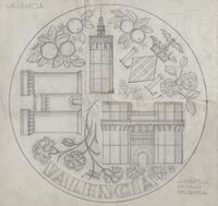 Boceto del anverso de una medalla religiosa de Valencia Boceto a lápiz del anverso de una medalla religiosa de Valencia, formada por un conjunto de elementos arquitectónicos de la ciudad junto a motivos decorativos frutales y florales.Para Acuñaciones Españolas. Otros Archivos.: MBR/1459