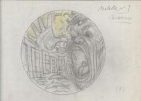 Boceto del anverso de la medalla nº9 -V centenario del descubrimiento de América Boceto a lápiz sobre fondo claro del anverso de la medalla número nueve donde en uno de los lados aparece en primer término la boca abierta de la cara de un marinero que grita: ¡Tierra!, cuyas letras están escritas sobre un fondo donde aparece la silueta de una pareja de delfines saltando en el mar.Para Numismática Iberica. OTROS ARCHIVOS: MBO/401+446 MBR/1343