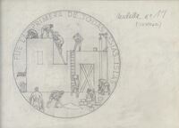Boceto del reverso de la medalla nº 19 serie V centenario del descubrimiento de América Boceto a lápiz del reverso de la medalla número diecinueve, donde se representa a un grupo de hombres trabajando en la construcción de un edificio en tierras indígenas, junto a las letras “Fue la primera de todas estas islas”.para Numismatica Iberica. Otros Archivos: MBR/1355(reverso) MBO/412+468