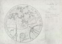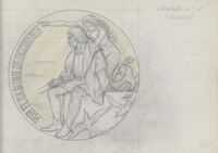 Boceto del anverso de la medalla nº1 -V centenario deldescubrimiento de America "La idea de Colon" (anverso) Boceto del anverso de la medalla número 1, a lápiz, sobre un fondo de color claro, donde se representa la figura de Cristóbal Colón sentado con un pergamino en la mano mirando al horizonte y detrás de él la figura de una sirena que extendiendo su brazo señala la dirección a donde debe dirigirse.V Centenario … medalla nº1 anverso para Numismatica Iberica.OTROS ARCHIVOS.: Mbo/.429. Mbo/383+386+394) Men/1782+1783) MBr/1335