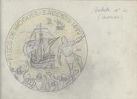 Boceto del reverso del medalla nº 4 -V centenario del descubrimiento deAmérica "Corte de Castilla" (reverso) Boceto a lápiz sobre fondo claro del reverso de la medalla número cuatro donde se representa la figura de Cristóbal Colón a caballo emprendiendo su viaje junto a la leyenda inscrita en el perfil de la medalla donde se lee que dice “Confiando en Dios y en la estima de los Reyes.”para Numismática Iberica. OTROS ARCHIVOS RELACIONADOS: MBO/435+393 MG/1529 MBR/1336