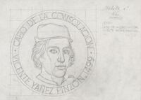 Boceto del anverso de la medalla nº 26 serie V centenario del descubrimiento de América. Boceto a lápiz del anverso de la medalla número veintiséis, con el retrato de Vicente Yañez, rodeado por la leyenda inscrita en el perfil de la medalla con su nombre y “Cabo de la Consolación”.para Numismática Iberica.OTROS ARCHIVOS:MBR/1365 (anv. Reverso) MBO/485