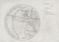 Boceto del reverso de la medalla nº 27 serie V centenario del descubrimiento de América. Boceto a lápiz del reverso de la medalla número veintisiete, donde aparece dos indígenas defendiéndose con arcos junto a la leyenda inscrita en el perfil de la medalla que dice “de tristeza y dolor tenían mezcla”.Para Numismática Iberica. OTROS ARCHIVOS: MBR/1341 MEN/Ficha. 1787 MBO/422 +486(anverso)