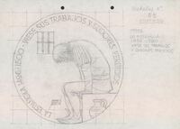 Boceto del anverso de la medalla nº 23 V centenario del descubrimiento de América. Boceto a lápiz del anverso de la medalla número veintitrés, con la imagen de un hombre con aptitud de abatimiento por su situación de encarcelamiento, junto a la leyenda inscrita en el perfil de la medalla que dice”La Española 1496- 1500 viese sus trabajos y sudores perdidos.”para Numismática Iberica OTROS ARCHIVOS: MBR/1356. MEN/1785 MBO/420+478