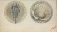 Boceto del campeonatos mundiales de ciclismo En el anverso de la medalla la imagen central de un ciclista con su bici rodeado por las letras campeonatos mundiales de ciclismo, en el reverso una gran concha símbolo de Donostia en cuyo interior la imagen de una esfera terrestre rodeado por las letras San Sebastián, España.
