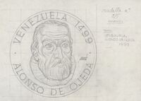 Boceto del anverso de la medalla nº 25 serie del V centenario del descubrimiento de América. Boceto a lápiz del anverso de la medalla número veinticinco, con un magnífico retrato de Alonso Ojeda cuyo nombre y Venezuela 1499 aparece rodeando el perfil de la medalla.para Numismática Iberica serie del V Centenario. OTROS ARCHIVOS. MBR/1339 (anv-rev.) MBO/390+424+483