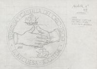 Boceto del anverso de la medalla nº 27 serie V centenario del descubrimiento de América. Boceto a lápiz del anverso de la medalla número veintisiete, donde aparece la figuras de dos manos saludándose y en el espacio que queda entre ellas la silueta de dos barcos españoles, rodeado por la leyenda inscrita en el perfil de la medalla que dice “Veragua y Castilla del Oro 1509, D. Nicuesa, A. Ojeda.”Para Numismatica Iberica. OTROS ARCHIVOS: MBR/1341.(anverso y reverso) MBO/422+487 MEN/1787(reverso)