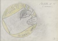 Boceto del reverso de la medalla nº5 -V centenario del descubrimiento de America (reverso) Boceto a lápiz sobre fondo claro del reverso de la medalla número cinco donde se representa las manos de un escribano que con una pluma redacta un documento alrededor de la escena ocupando el perfil de la medalla se lee “capitulación de Santa Fe 17 de Abril 1492”.Serie para Numismática Iberica (revrs.) OTROS ARCHIVOS: MD/439 MBR/1342 MEP/1767+1768