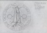 Bodas de Oro reverso Boceto a lápiz de una medalla conmemorativa de las Bodas de Oro de un matrimonio, junto a la leyenda inscrita en el perfil que dice que lo que Dios ha unido no lo separe el hombre, con la imagen central de dos manos unidas junto a los símbolos de Dios, hombre y mujer.Para Numismatica Iberica