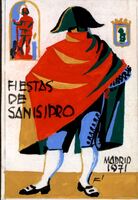 Cartel de las Fiestas San Isidro Cartel con la imagen central de un hombre de frente, con los brazos apoyados sobre la cintura, con una gran capa que envuelve la cara y parte del personaje dejando ver algo del traje del luces, indicándonos que se trata de un personaje decimonónico por la indumentaria y el sombrero.