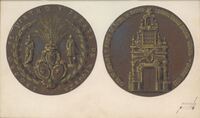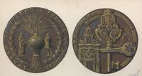 Caja de Ahorros Monte de Piedad de Madrid Medalla en donde una de sus caras se puede leer por las letras inscritas en el metal “Ahorro es virtud y fuente de riqueza”con la imagen central de una corona de laurel en cuyo espacio interior aparece un ramo de trigo junto a dos figuras, a su lado la otra cara representa la fachada principal del edificio de la Caja de Ahorros de Monte de Piedad en Madrid.para la C.A.M.P. de Madrid edificio Central Otros Archivos.:MBR/1496 MBO/363
