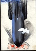Cartel Bélico Sobre un fondo blanco, contrasta la figura de un proyectil en negro y azul impactando sobre una ciudad, en la cabecera de dicho proyectil, la figura de una paloma blanca alzando el vuelo, insinuando así que no son tiempos para ella, para la Paz, que es lo que representa sino todo lo contrario, obligada por tanto a alzar el vuelo, en la parte inferior del cartel unas casas donde impactará el proyectl. Firma abreviada en la parte superior derecha del cartel.