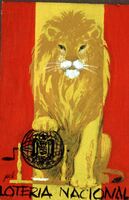 Cartel de la Lotería Nacional Como fondo los colores de la bandera nacional, con la imagen central de un león que bajo una de sus patas sujeta un bombo de la suerte con la figura del águila. El resultado final tiene mucha fuerza.Sorteo que secelebro en "Leon". Leyenda en la parte inferior "LOTERIA NACIONAL