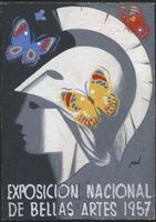 Cartel De Bellas Artes 1957 Sobre un fondo dividido por dos tonos de grises, como imagen central la cabeza de perfil de la diosa minerva, contrastado por los colores vivos de las mariposas que revolotean a su alrededor.Leyenda "EXPOSICION NACIONAL DE BELLAS ARTES 1957"