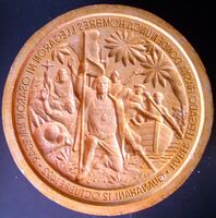 "De ver tan grande golpe de agua dulce"-V centenario deldescubrimiento de América (reverso "Exploración de Brasil" Molde de escayola, con barniz de goma laca, del negativo de la cara de una medalla donde se aprecia en primer término una indígena en una hamaca mirando a un hombre en una canoa en el mar.Para Numismatica Iberca, reverso OTROS ARCHIVOS: mbo/484+485 MBR/1365